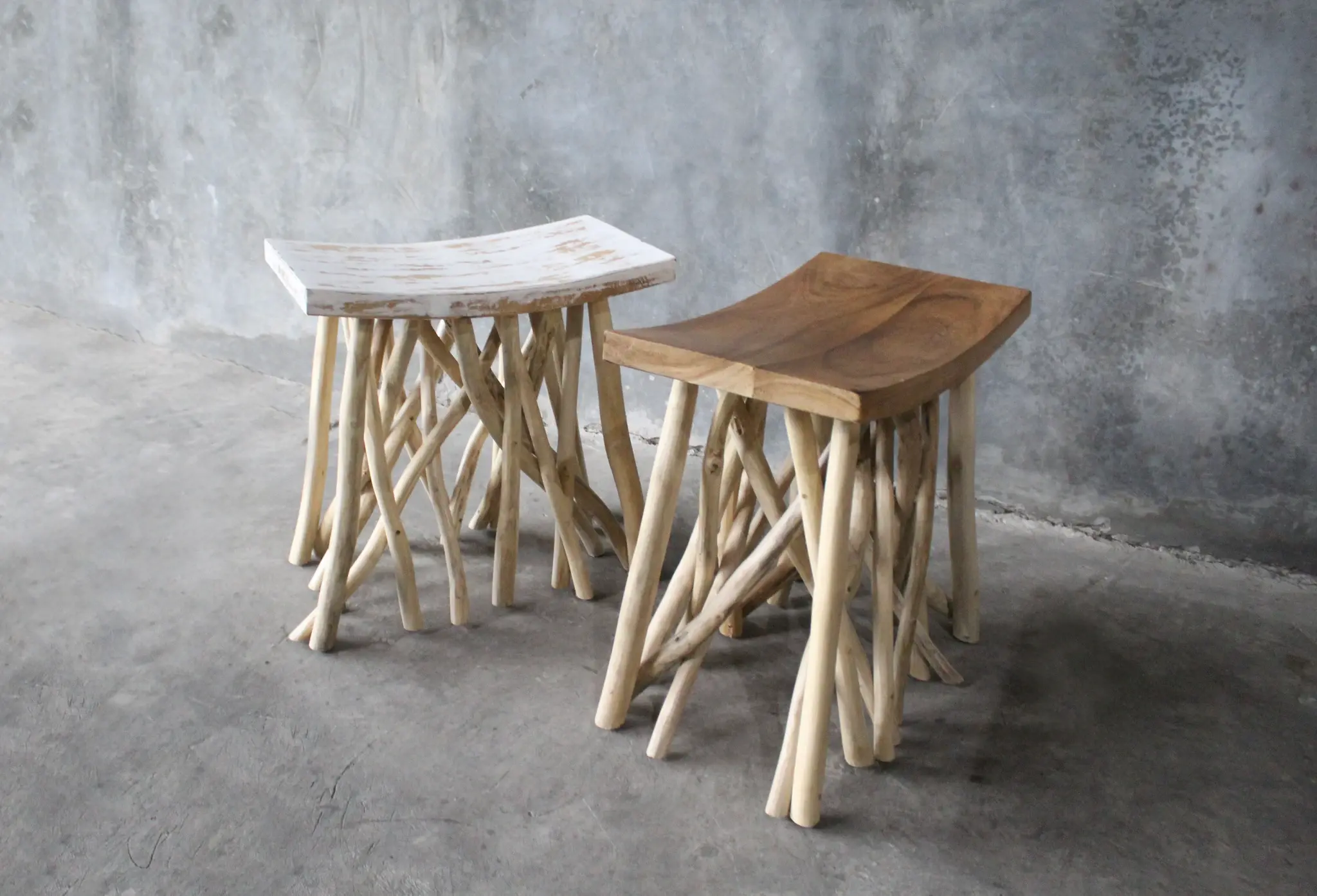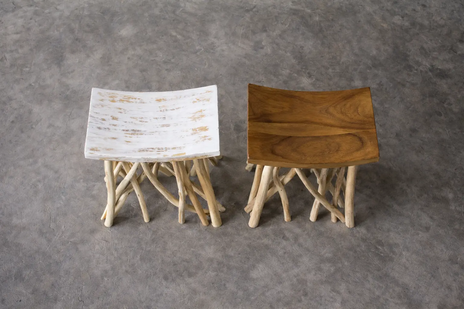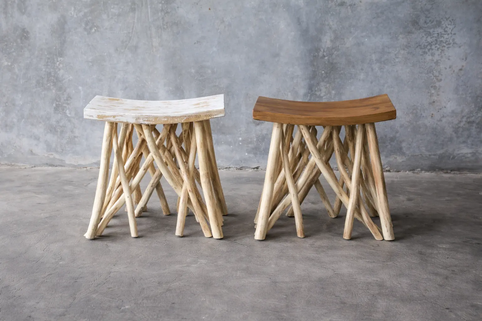 This rustic wood stool showcases a unique natural design crafted from intertwined solid wood branches that form a sturdy and artistic base. The gently curved wooden seat provides comfort while highlighting the natural wood grain and organic texture. Each piece has its own character, making every stool slightly unique. Perfect for rustic, tropical, or natural-style interiors, this stool combines functionality with handcrafted charm, creating a warm and authentic accent for living spaces, patios, or decorative seating areas.