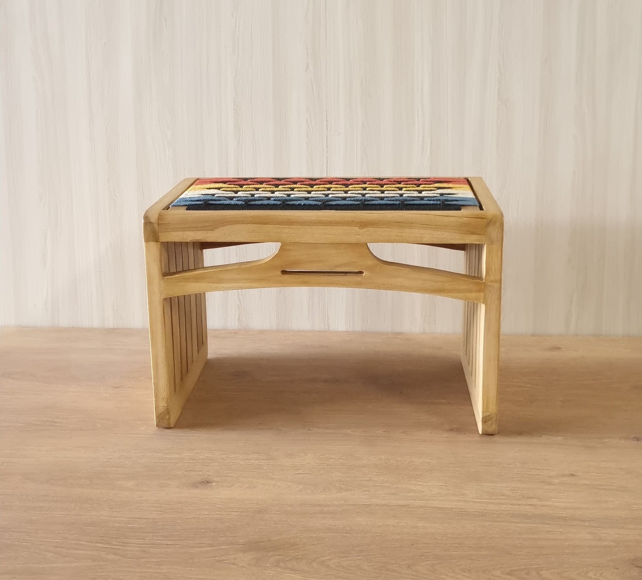 This stool showcases the beauty of handwoven multicolour rope in every intricate detail. Versatile in design, it can also be used as a stylish laptop table — helping you stay productive in style.
