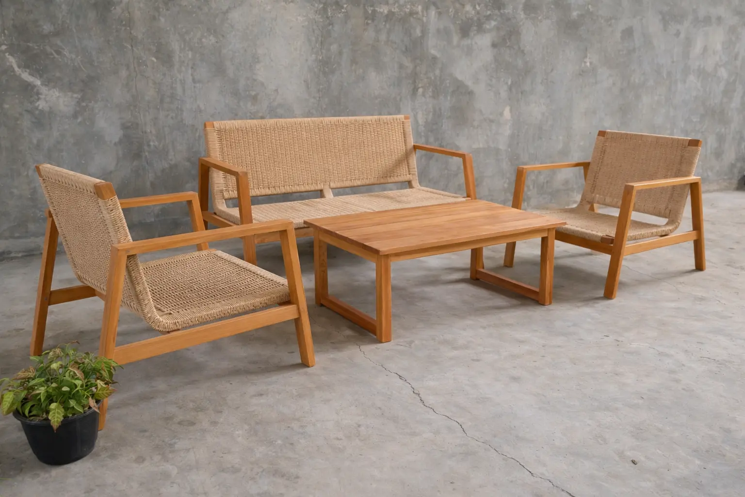 This elegant lounge set combines solid teak wood with natural rattan weaving, creating a warm and timeless design. The set includes a two-seater bench, two armchairs, and a wooden coffee table. Its minimalist structure and natural materials make it perfect for living rooms, patios, or lounge areas. Durable, comfortable, and stylish, this furniture set adds a natural and modern touch to any space.