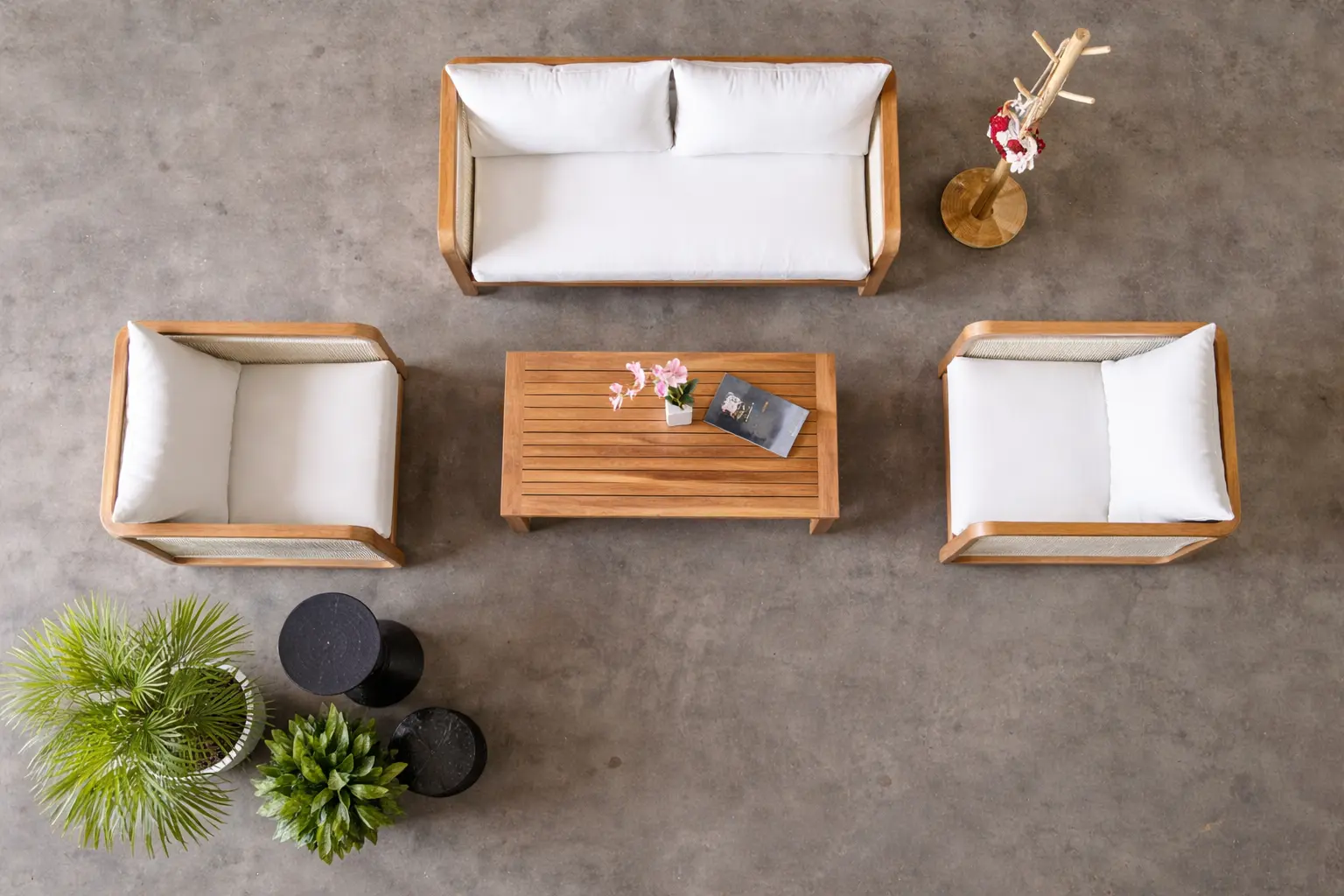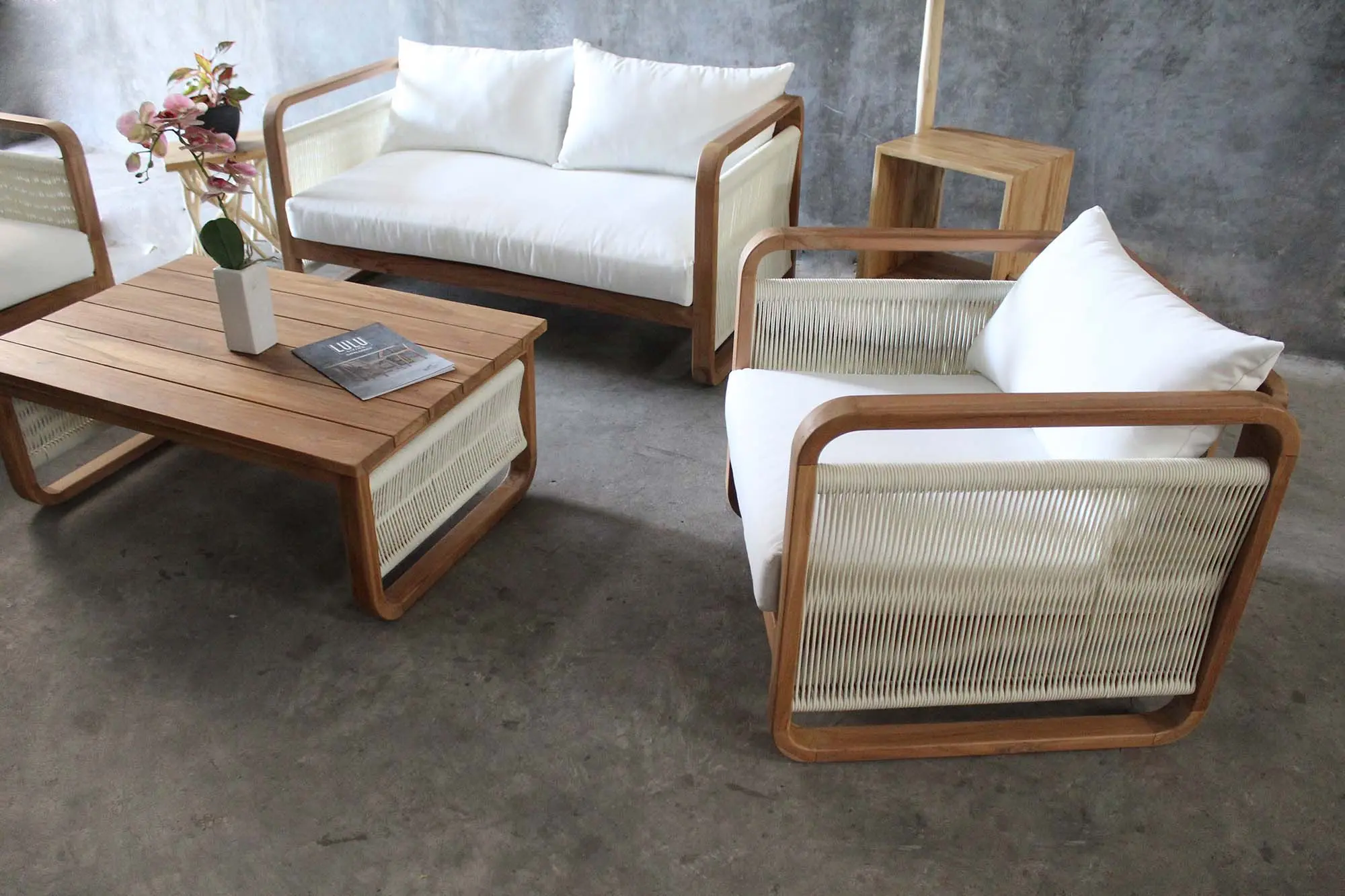 Eleanor Living Set – Premium Teak Wood Lounge Furniture for Export The Eleanor Living Set is a beautifully crafted lounge furniture collection made from high-quality solid teak wood, designed for durability and timeless elegance. This set includes a two-seater sofa, two comfortable armchairs, and a matching wooden coffee table, making it a perfect solution for both indoor and outdoor living spaces. Featuring a smooth curved design and natural teak finish, this furniture set highlights the beauty of Indonesian craftsmanship. The soft, high-density white cushions provide exceptional comfort while maintaining a clean, modern aesthetic suitable for contemporary interiors. Ideal for living rooms, patios, resorts, villas, and hospitality projects, the Eleanor Living Set is built to withstand daily use while offering long-lasting performance. The use of premium teak wood ensures resistance to weather, moisture, and wear, making it an excellent choice for export-quality furniture. We specialize in manufacturing and exporting high-quality teak furniture from Indonesia, offering customization options to meet your project or wholesale needs.