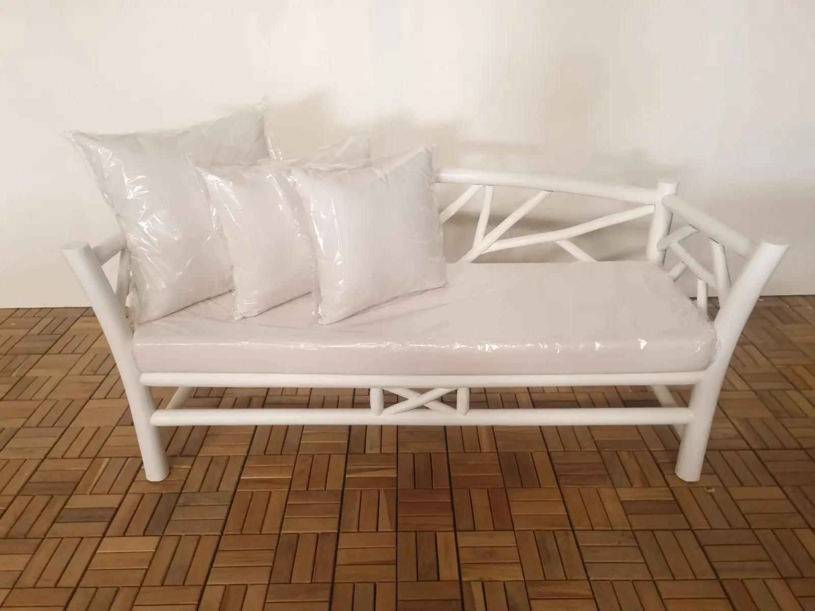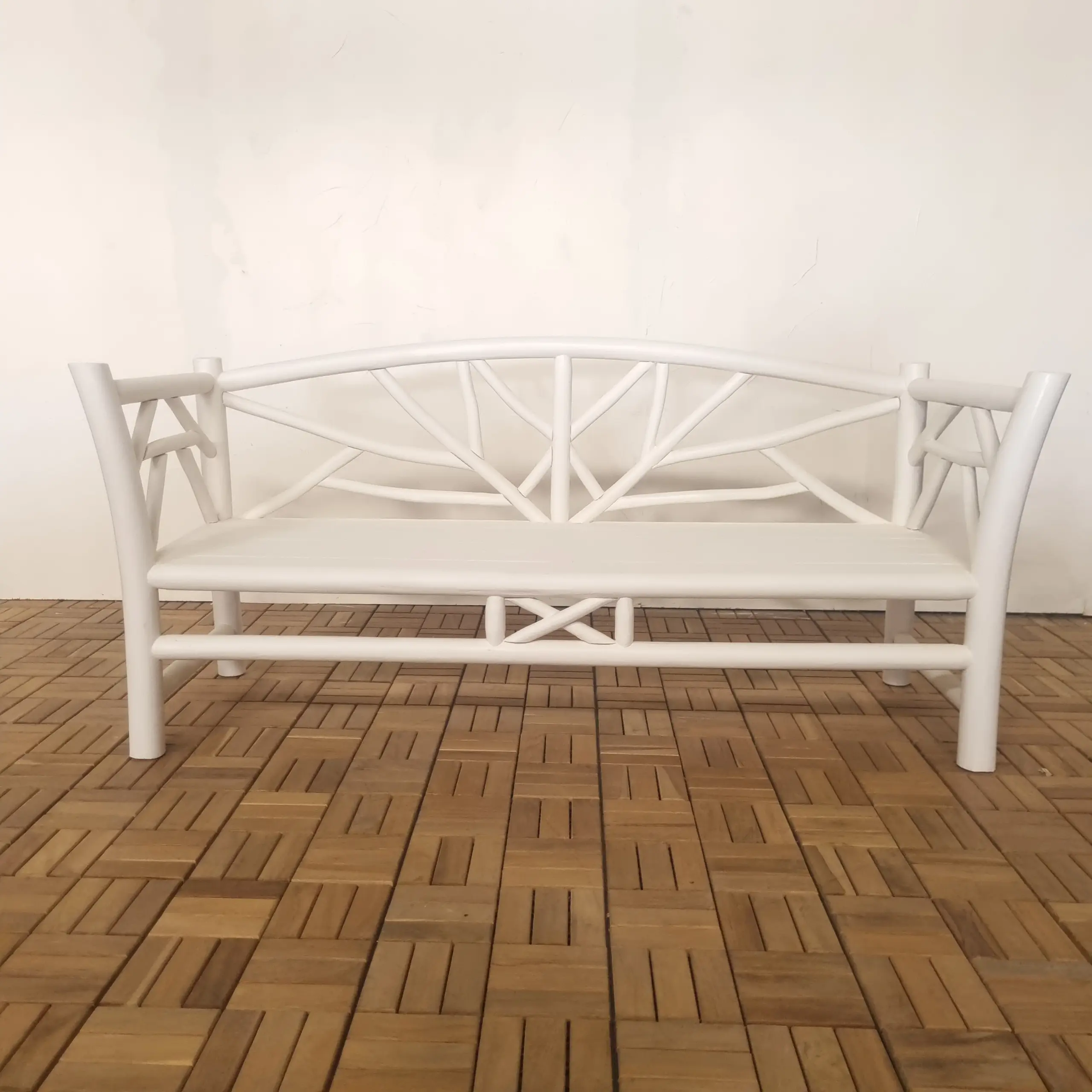 Teak Sofa Indonesia – Haiti Sofa Bench | Handmade Export Furniture The Haiti Sofa Bench is a perfect blend of minimalist design and natural elegance, crafted to enhance both modern and tropical interiors. With its clean lines and distinctive branch-inspired frame, this piece delivers a unique visual identity while maintaining a warm and inviting atmosphere. The combination of a solid structure and soft cushions makes it ideal for living spaces, lounges, or hospitality environments seeking comfort with style. Built from premium solid teak wood sourced from Indonesia, this bench showcases the strength and beauty of high-quality Indonesian teak wood. The smooth painted finish adds a contemporary touch, while the natural wood construction ensures durability and long-term performance. The seat is complemented by comfortable upholstered cushions, providing both support and relaxation. Crafted with sustainability in mind, this piece is both durable and eco-friendly. As a trusted Indonesian Furniture Manufacturer, we specialize in producing export quality furniture for global B2B markets. The Nauru Divider Bench is ideal for wholesalers, interior designers, retailers, and hospitality projects looking for wholesale furniture with distinctive design and consistent quality. We support bulk orders, custom finishes, and worldwide shipping.