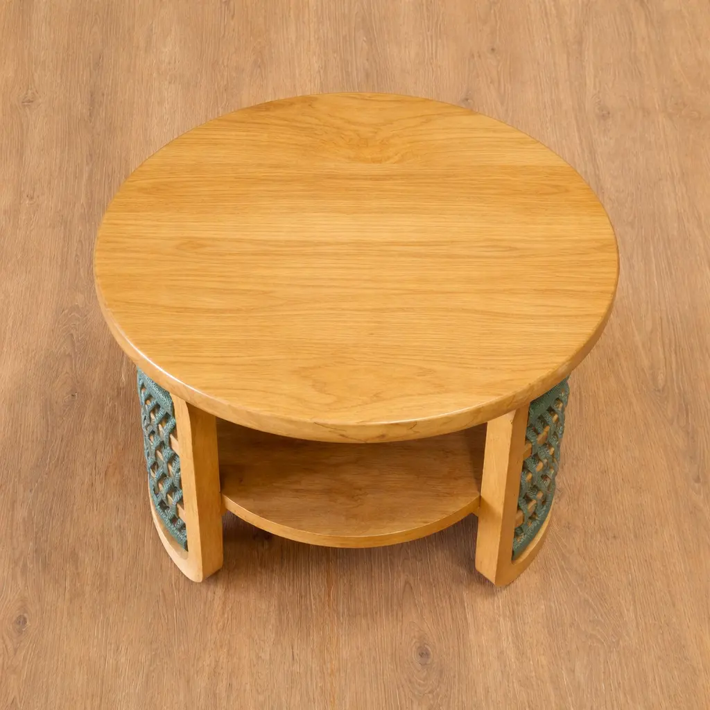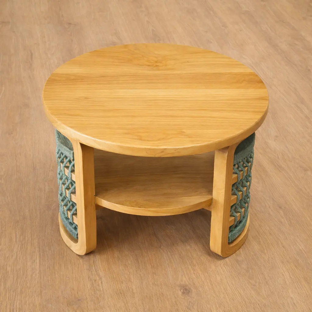 Inara Table combines functionality with style—crafted from solid teak wood with a natural warm color finish, it features an open shelf design and vibrant multicolor rope weaving. A perfect accent piece to elevate any space.