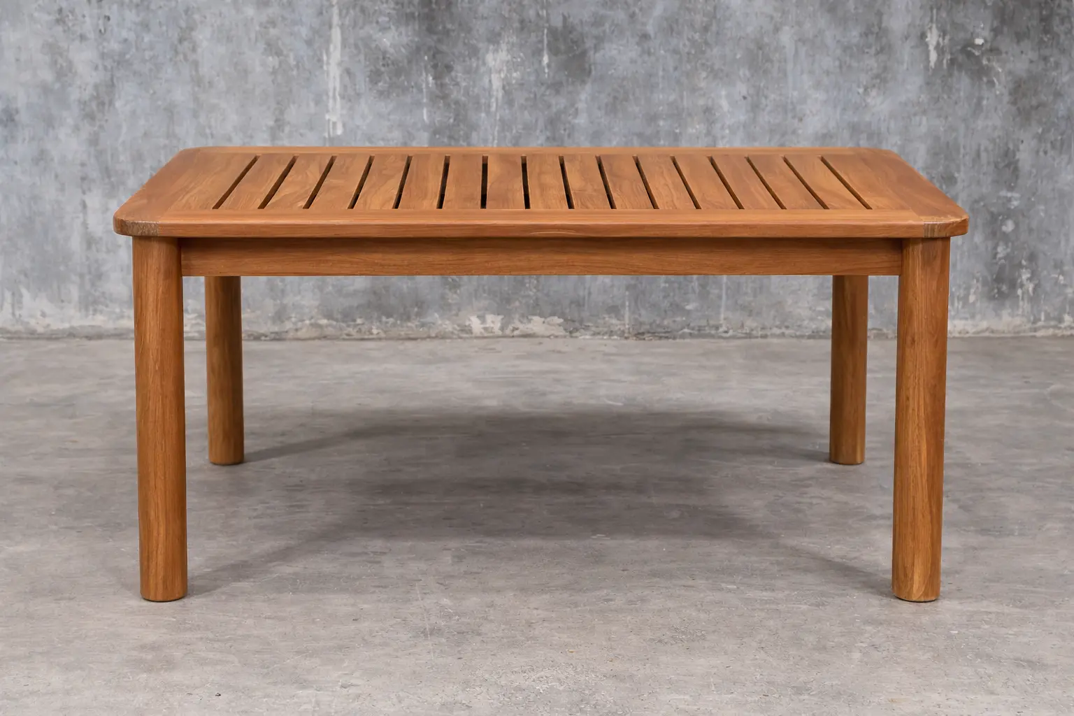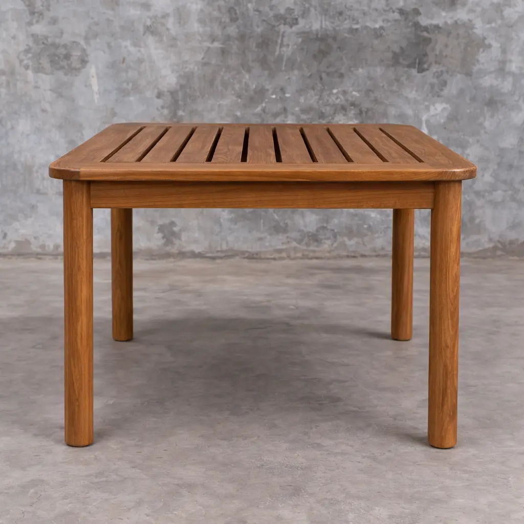 This solid teak coffee table features a clean, minimalist design with a slatted top that adds both visual character and practical functionality. The warm natural wood tone highlights the beautiful grain, while the rounded corners and sturdy cylindrical legs create a balanced and elegant look. Perfect for living rooms, patios, or lounge areas, this table combines durability with timeless style, making it a versatile piece for both indoor and outdoor settings.
