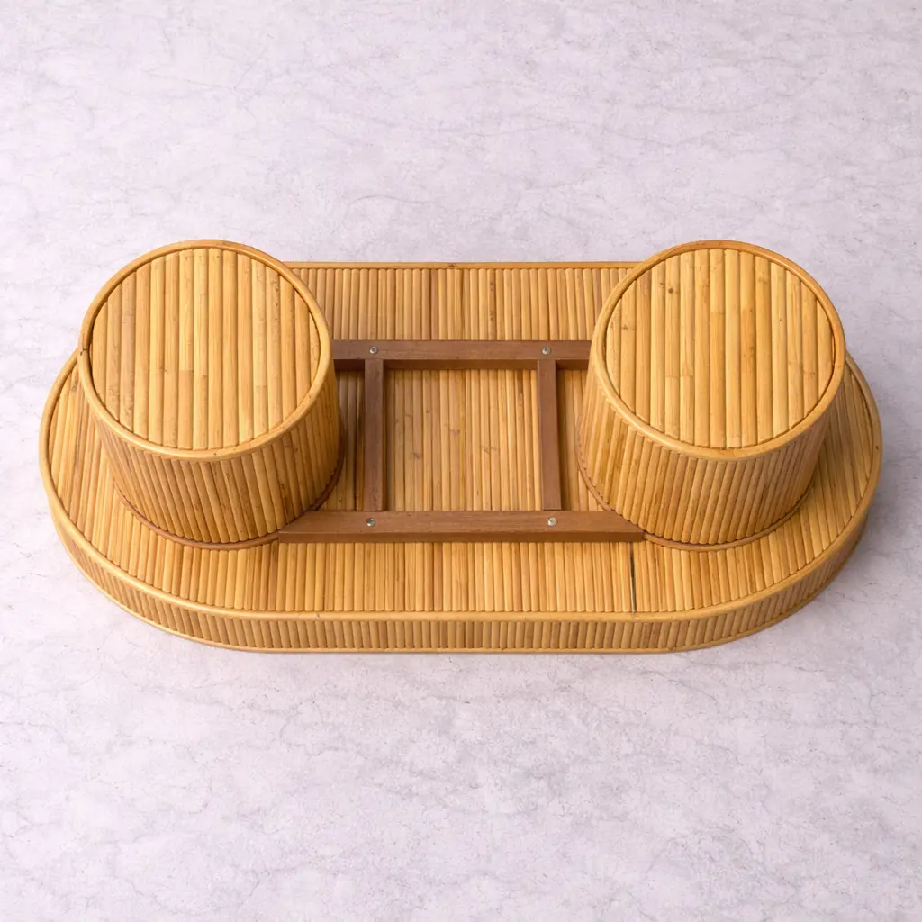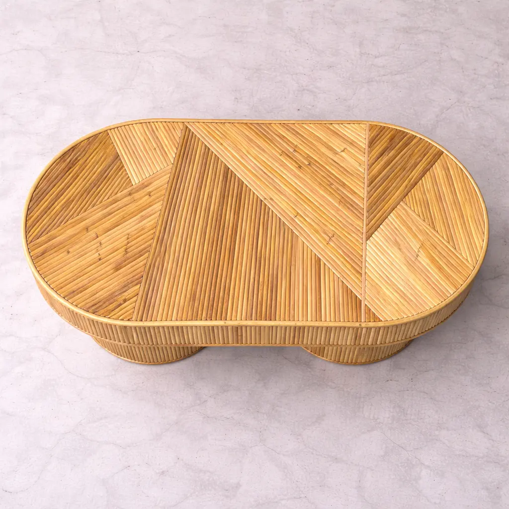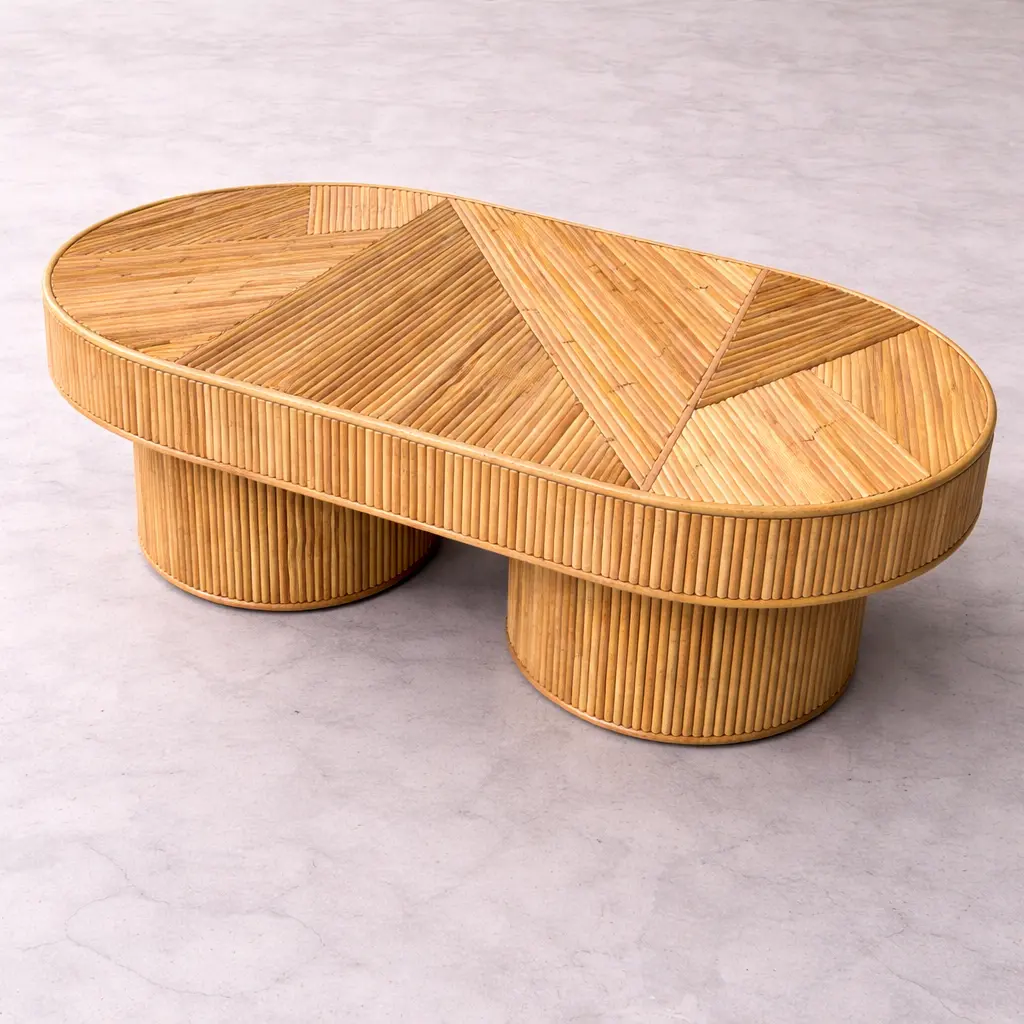 The Lulu Coffee Table Oval showcases a unique blend of natural craftsmanship and modern design. Crafted from carefully arranged bamboo, the tabletop features a striking geometric pattern that highlights the natural texture and warm tones of the material. Supported by sturdy cylindrical bases, the table offers both stability and sculptural appeal. Its organic form and elegant details make it a perfect centerpiece for living rooms, lounges, or contemporary tropical interiors.