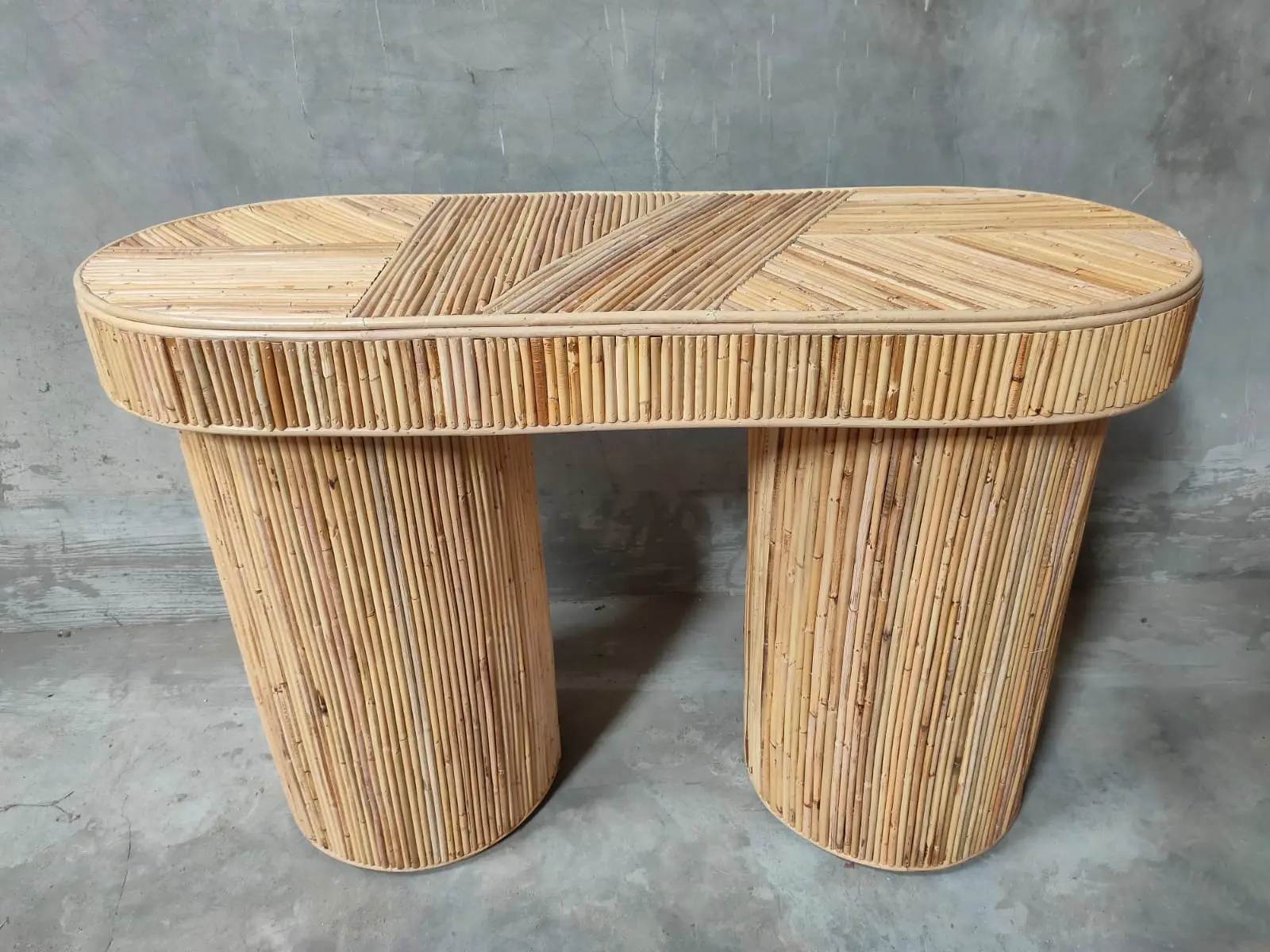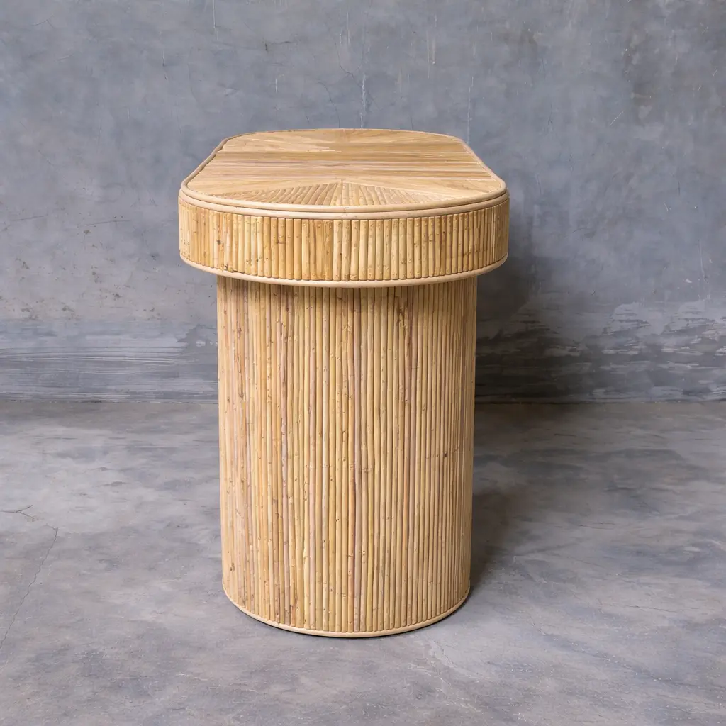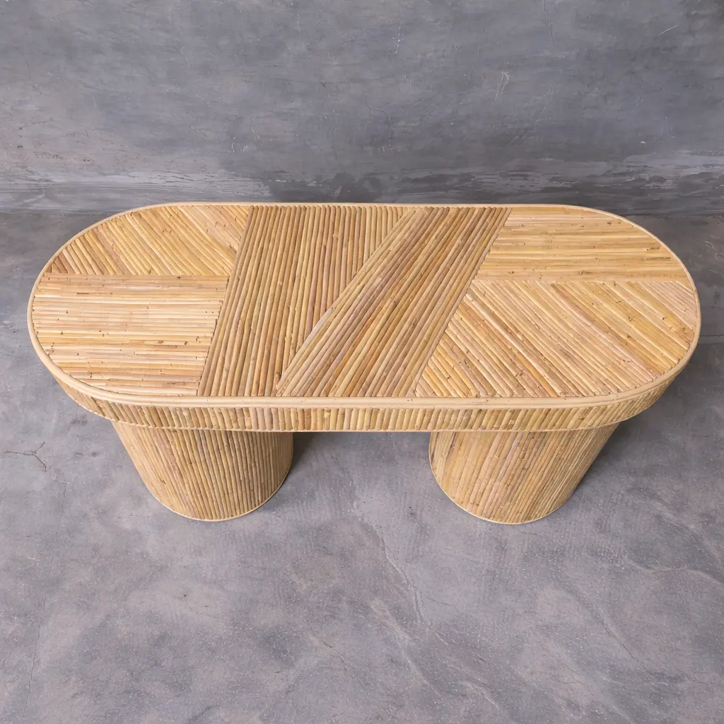 Rattan Console Table Indonesia – Handmade Natural Rattan Furniture This elegant rattan console table showcases the timeless beauty of natural materials and handcrafted design. Featuring a refined oval tabletop with a distinctive woven pattern, it combines diagonal and vertical rattan arrangements to create a rich textured surface. Its organic form and warm tones bring a relaxed tropical atmosphere, making it a perfect addition to living spaces, entryways, or stylish resort-inspired interiors. Expertly handcrafted by skilled artisans in Indonesia, this piece highlights authentic handwoven rattan craftsmanship. The sturdy cylindrical rattan legs and detailed frame ensure both stability and durability, while maintaining a lightweight and natural aesthetic. Built with sustainable materials, this console table reflects eco-conscious production and offers long-lasting performance suitable for indoor use. As a trusted Indonesian Furniture Manufacturer, we produce export quality furniture for global B2B markets. This rattan console table is ideal for wholesalers, retailers, interior designers, and hospitality projects seeking wholesale furniture with natural character and artisanal value. We support bulk orders, custom designs, and worldwide shipping to meet international buyer needs.