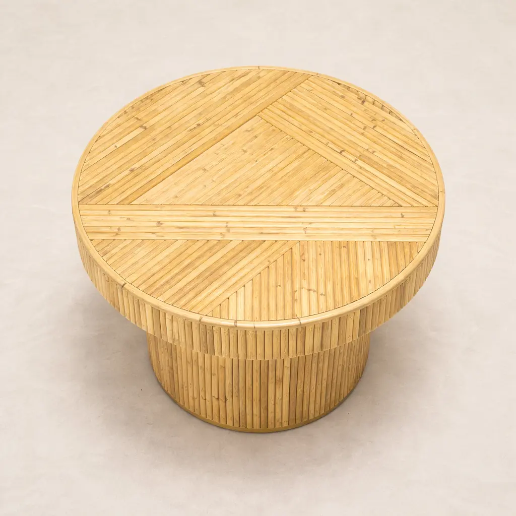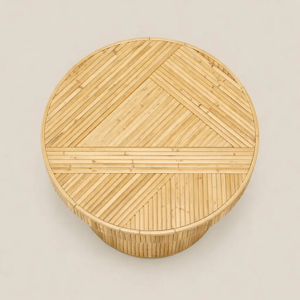 Rattan Round Table Indonesia – Natural Woven Coffee Table | Handmade Export Furniture This round rattan table brings together organic beauty and contemporary design, creating a warm and inviting centerpiece for any space. The tabletop features a unique geometric pattern formed by carefully arranged rattan sticks, adding visual depth and artisanal character. Paired with a cylindrical base wrapped in vertical rattan, this piece delivers a balanced and textured aesthetic—perfect for living rooms, lounges, or tropical-inspired interiors. Expertly handcrafted by skilled artisans in Indonesia, this table highlights authentic handwoven rattan craftsmanship. The natural rattan material offers a lightweight yet sturdy structure, while its warm tones enhance the overall ambiance of the space. Built with sustainable materials, this table is both durable and eco-friendly, making it suitable for long-term indoor use with a natural lifestyle appeal. As a trusted Indonesian Furniture Manufacturer, we produce export quality furniture tailored for global B2B markets. This rattan table is ideal for wholesalers, retailers, interior designers, and hospitality projects seeking reliable wholesale furniture with a natural and artistic touch. We support bulk orders, custom designs, and worldwide shipping.