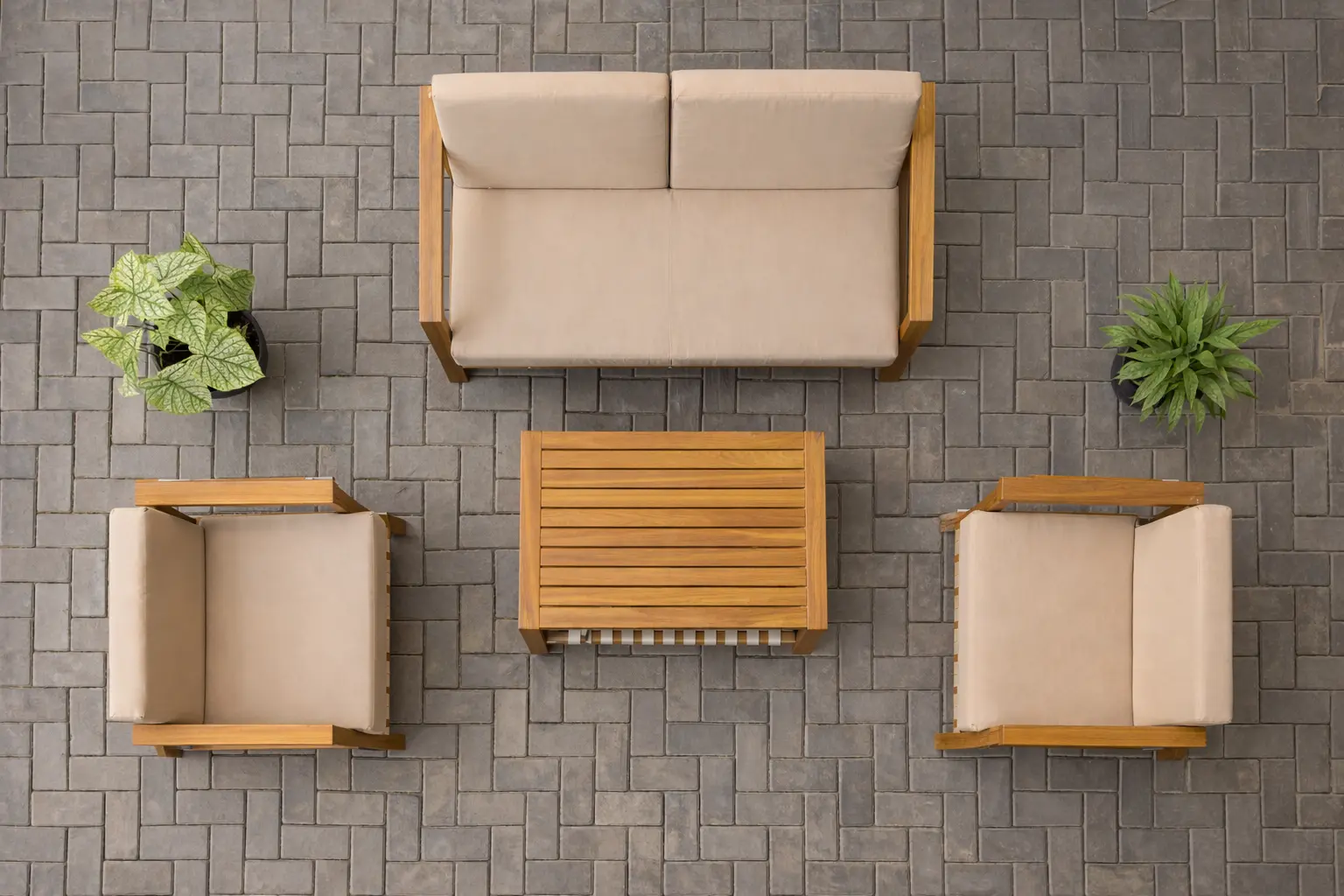 Teak Outdoor Lounge Set Indonesia – Modern Patio Furniture | Handmade Export Furniture This outdoor lounge set presents a perfect combination of modern elegance, comfort, and natural beauty. Designed with clean lines and a minimalist silhouette, it creates a relaxing and stylish atmosphere for patios, gardens, and outdoor living spaces. The warm teak finish paired with soft beige cushions delivers a refined yet inviting look, ideal for both residential and hospitality environments. Crafted from premium solid teak wood sourced from Indonesia, this set ensures exceptional durability, strength, and resistance to outdoor conditions. The high-quality cushions provide superior comfort, while the sturdy wooden frame guarantees long-term performance. Built with sustainable materials and expert craftsmanship, this furniture set is both durable and eco-friendly, making it suitable for continuous outdoor use. As a trusted Indonesian Furniture Manufacturer, we specialize in producing export quality furniture for global B2B markets. This lounge set is perfect for wholesalers, retailers, interior designers, and hospitality projects seeking reliable wholesale furniture with modern outdoor appeal. We support bulk orders, custom specifications, and worldwide shipping to meet international standards.