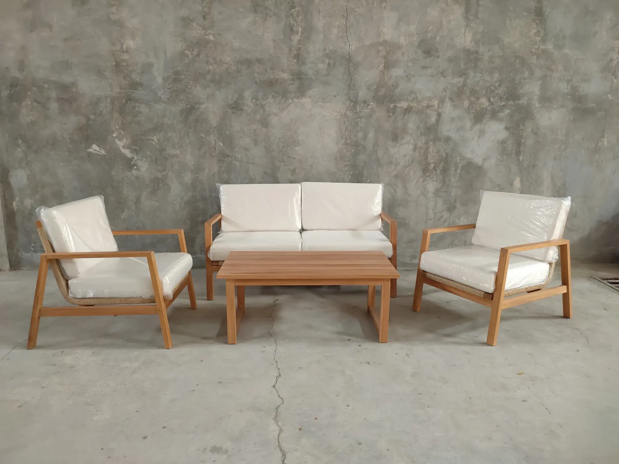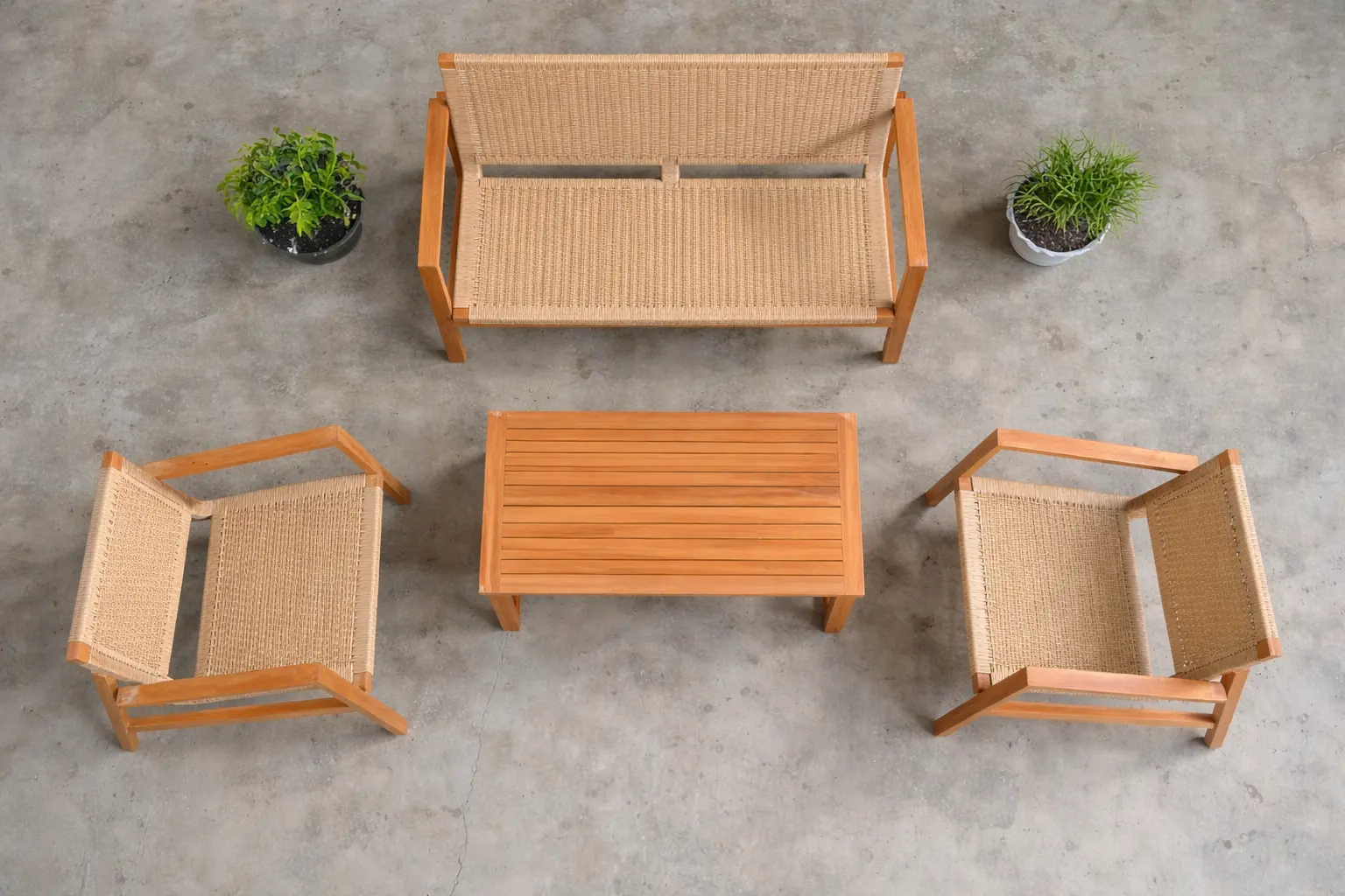 This elegant lounge set combines solid teak wood with natural rattan weaving, creating a warm and timeless design. The set includes a two-seater bench, two armchairs, and a wooden coffee table. Its minimalist structure and natural materials make it perfect for living rooms, patios, or lounge areas. Durable, comfortable, and stylish, this furniture set adds a natural and modern touch to any space.