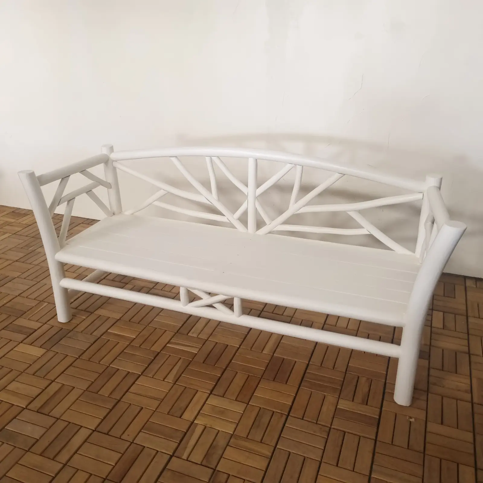 Teak Sofa Indonesia – Haiti Sofa Bench | Handmade Export Furniture The Haiti Sofa Bench is a perfect blend of minimalist design and natural elegance, crafted to enhance both modern and tropical interiors. With its clean lines and distinctive branch-inspired frame, this piece delivers a unique visual identity while maintaining a warm and inviting atmosphere. The combination of a solid structure and soft cushions makes it ideal for living spaces, lounges, or hospitality environments seeking comfort with style. Built from premium solid teak wood sourced from Indonesia, this bench showcases the strength and beauty of high-quality Indonesian teak wood. The smooth painted finish adds a contemporary touch, while the natural wood construction ensures durability and long-term performance. The seat is complemented by comfortable upholstered cushions, providing both support and relaxation. Crafted with sustainability in mind, this piece is both durable and eco-friendly. As a trusted Indonesian Furniture Manufacturer, we specialize in producing export quality furniture for global B2B markets. The Nauru Divider Bench is ideal for wholesalers, interior designers, retailers, and hospitality projects looking for wholesale furniture with distinctive design and consistent quality. We support bulk orders, custom finishes, and worldwide shipping.