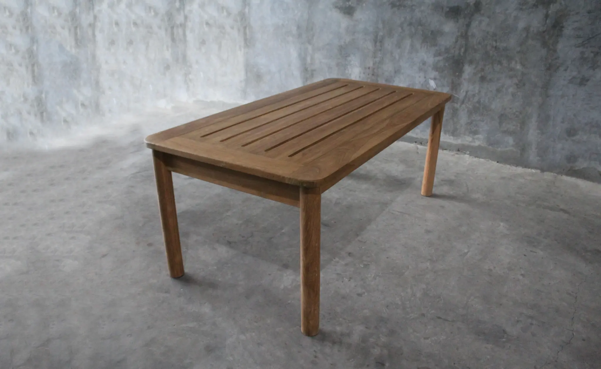 This solid teak coffee table features a clean, minimalist design with a slatted top that adds both visual character and practical functionality. The warm natural wood tone highlights the beautiful grain, while the rounded corners and sturdy cylindrical legs create a balanced and elegant look. Perfect for living rooms, patios, or lounge areas, this table combines durability with timeless style, making it a versatile piece for both indoor and outdoor settings.