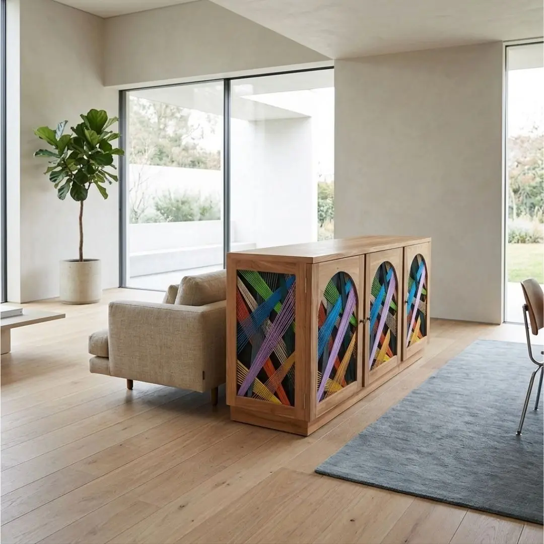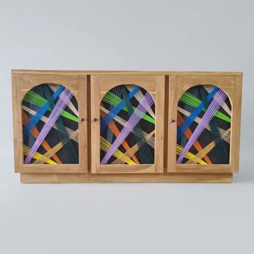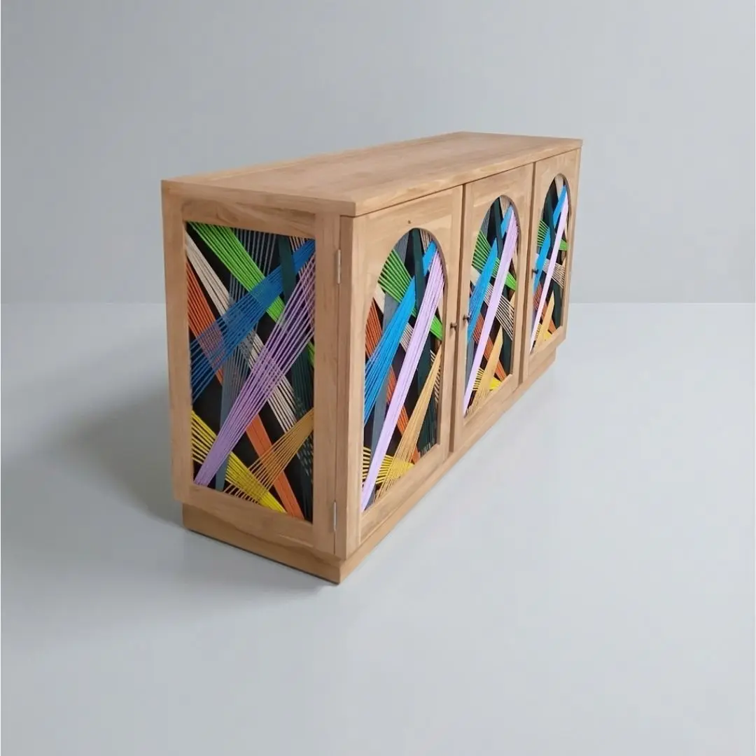 Lulu Bliss Cabinet is a bold expression of free-spirited, adventurous style, brought to life through its vibrant rope accents. The playful mix of colors adds a distinctive character, making this piece both functional and visually captivating. Crafted with a sturdy solid teak wood frame, it offers durability alongside a warm, natural aesthetic. Behind its artistic exterior, the cabinet provides spacious storage—perfect for organizing your essentials while keeping your space neat and stylish. Designed for versatility, the Lulu Bliss Cabinet works beautifully in your living room as a TV console or a statement storage piece. Style it with your favorite décor to create a personalized look that reflects your unique taste. A perfect balance of practicality and creativity, this cabinet brings energy and individuality into any interior.