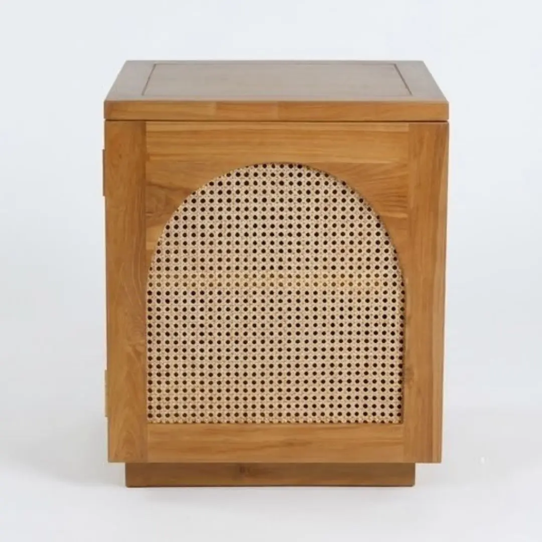 Lulu Nightstand is a perfect blend of functionality and natural beauty. Designed with spacious storage, it keeps your books and essentials neatly within reach, while its smooth top surface serves beautifully as a side table for your bedside lamp or décor. Crafted from solid teak wood and accented with natural rattan weaving, Lulu brings a warm, organic charm that enhances any bedroom with a calm and inviting atmosphere.