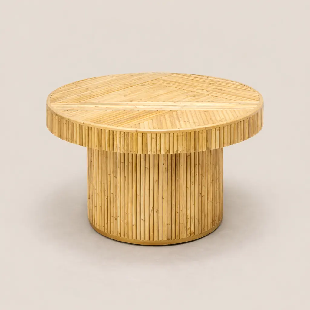 Rattan Round Table Indonesia – Natural Woven Coffee Table | Handmade Export Furniture This round rattan table brings together organic beauty and contemporary design, creating a warm and inviting centerpiece for any space. The tabletop features a unique geometric pattern formed by carefully arranged rattan sticks, adding visual depth and artisanal character. Paired with a cylindrical base wrapped in vertical rattan, this piece delivers a balanced and textured aesthetic—perfect for living rooms, lounges, or tropical-inspired interiors. Expertly handcrafted by skilled artisans in Indonesia, this table highlights authentic handwoven rattan craftsmanship. The natural rattan material offers a lightweight yet sturdy structure, while its warm tones enhance the overall ambiance of the space. Built with sustainable materials, this table is both durable and eco-friendly, making it suitable for long-term indoor use with a natural lifestyle appeal. As a trusted Indonesian Furniture Manufacturer, we produce export quality furniture tailored for global B2B markets. This rattan table is ideal for wholesalers, retailers, interior designers, and hospitality projects seeking reliable wholesale furniture with a natural and artistic touch. We support bulk orders, custom designs, and worldwide shipping.