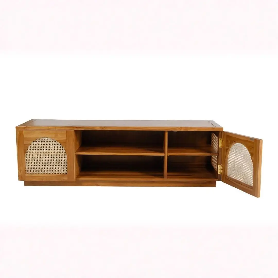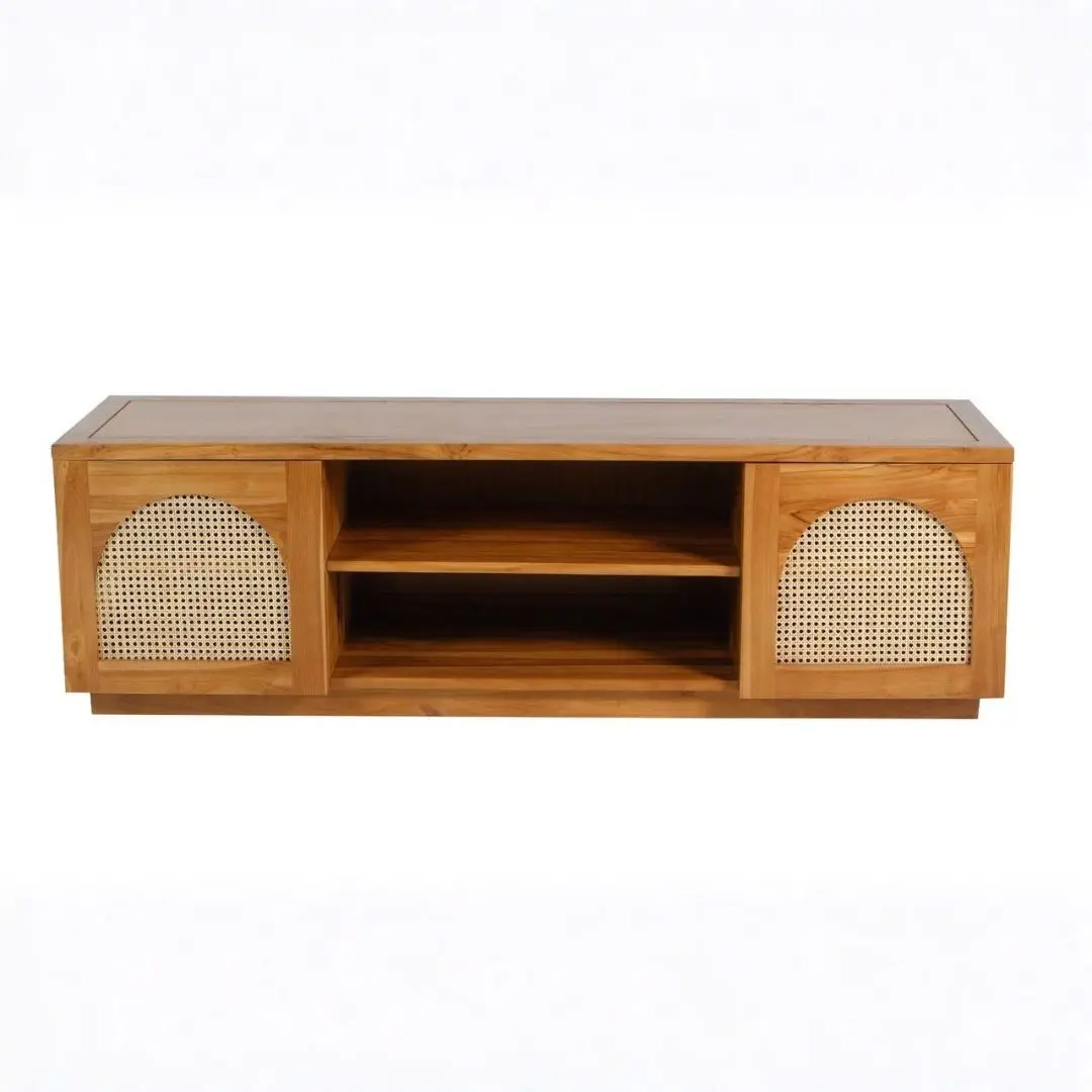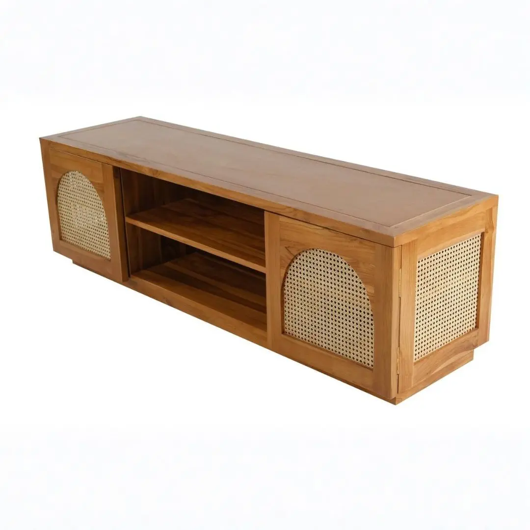 Lulu Living TV Cabinet is a beautiful piece that brings warmth and charm to your living room. Crafted from solid teak wood and enhanced with a lovely combination of natural rattan, it offers a timeless, organic look that blends effortlessly with any interior style. More than just a decorative statement, this cabinet is designed with functionality in mind. It features two spacious shelves, providing practical storage for your media essentials while keeping your space neat and organized.