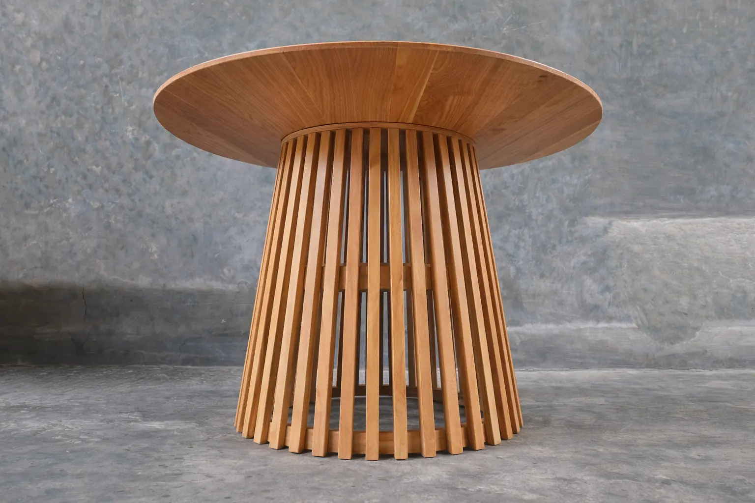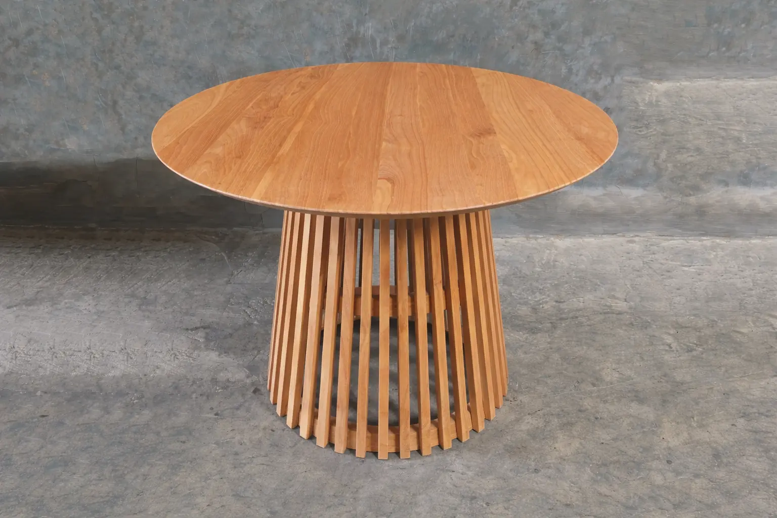 Teak Round Dining Table Indonesia – Modern Slatted Base Table | Handmade Export Furniture This round wooden dining table showcases a clean, modern design that highlights the natural beauty of solid wood. The smooth circular tabletop reveals elegant wood grain patterns, while the sculptural slatted base creates a striking architectural statement. With its warm natural finish and balanced proportions, this table becomes a welcoming centerpiece—perfect for dining rooms, cafés, and contemporary hospitality interiors. Expertly crafted from premium solid teak wood sourced from Indonesia, this dining table offers exceptional strength, durability, and long-term performance. The handcrafted construction ensures precision and quality, while the natural teak finish emphasizes sustainability and timeless appeal. Built to be durable and eco-friendly, this piece is ideal for both residential and commercial use. As a trusted Indonesian Furniture Manufacturer, we produce export quality furniture tailored for global B2B markets. This dining table is an excellent choice for wholesalers, retailers, interior designers, and hospitality projects seeking reliable wholesale furniture with modern aesthetics and consistent quality. We support bulk orders, custom dimensions, and worldwide shipping.