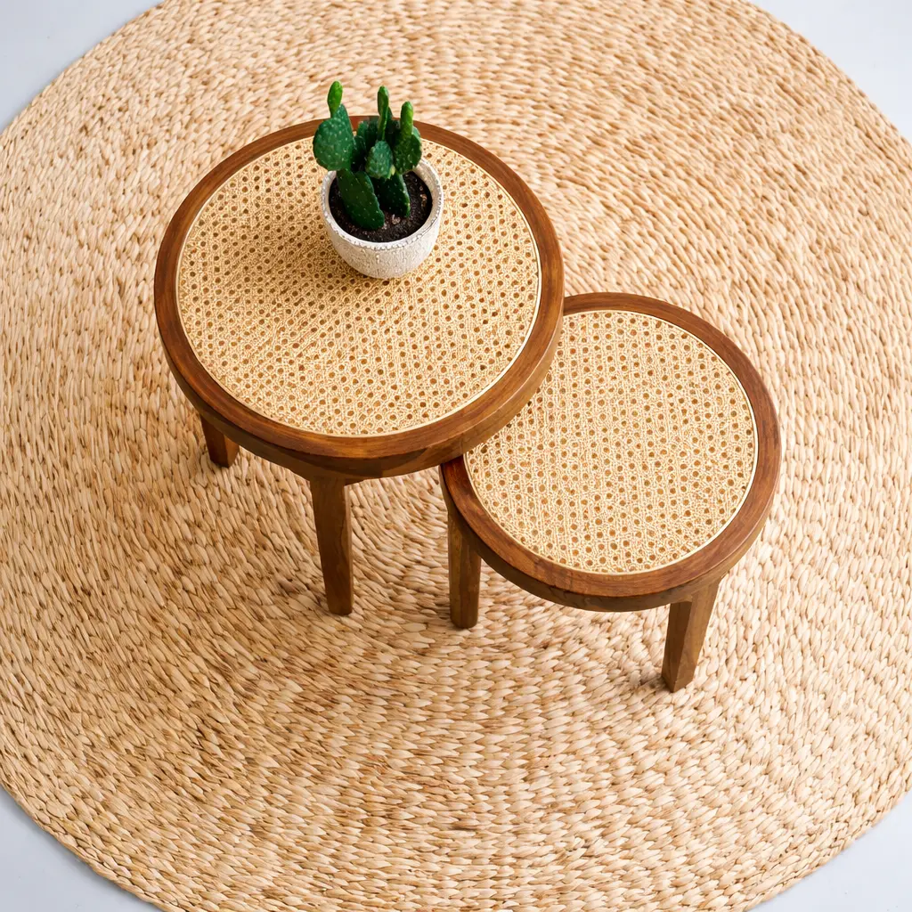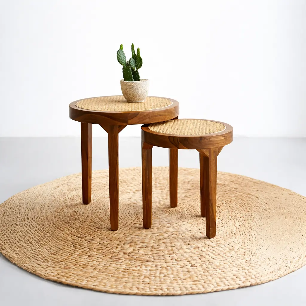 This elegant nesting side table set combines solid wood craftsmanship with natural cane weaving. The round tabletops feature beautifully woven rattan cane that adds texture and warmth, while the sturdy wooden frames and tapered legs provide stability and timeless style. Designed as a nesting set, the smaller table can easily slide under the larger one for flexible use. Perfect for living rooms, bedrooms, or lounge spaces, these tables bring a natural, modern, and functional touch to any interior.