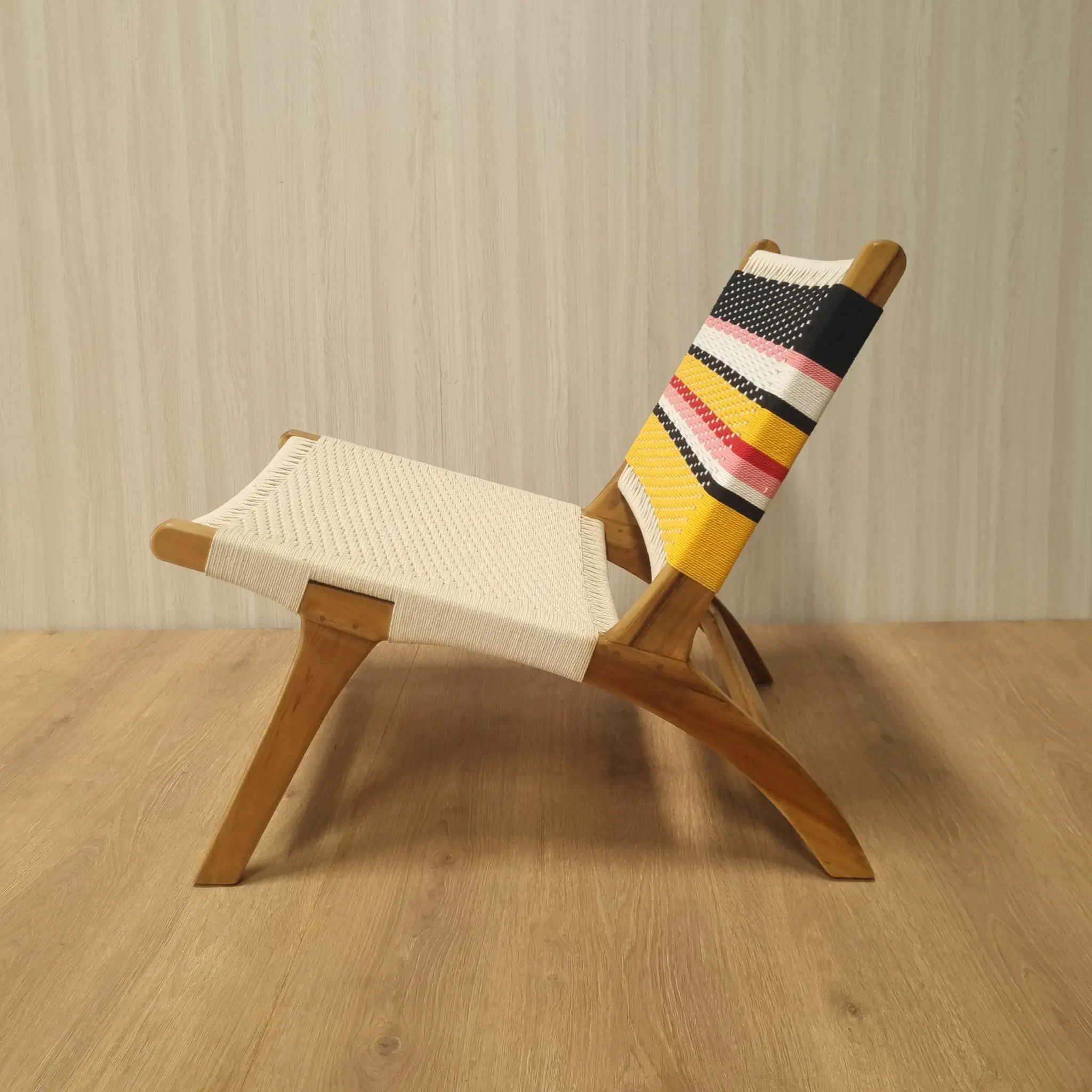 Teak Rope Chair Indonesia – Paris Catania Chair | Handmade Export Furniture The Paris Catania Chair, one of our best-selling collections, now comes with a stylish rope weaving design that enhances both comfort and visual appeal. Featuring a modern and playful aesthetic, this chair stands out with its vibrant multicolor patterns, making it a perfect choice for contemporary spaces, cafés, resorts, and hospitality projects. Its unique look adds character while maintaining a clean and elegant silhouette. Crafted from high-quality solid teak wood sourced from Indonesia, this chair ensures exceptional strength, durability, and long-term performance. The seat and backrest are expertly handwoven using premium rope, providing flexible support and superior comfort. This combination of durable teak wood and handwoven craftsmanship reflects a sustainable and eco-conscious approach, ideal for both indoor and semi-outdoor use. As a reliable Indonesian Furniture Manufacturer, we produce export quality furniture tailored for global B2B markets. The Paris Catania Chair is ideal for wholesalers, retailers, interior designers, and project-based buyers seeking wholesale furniture with unique design value. We offer scalable production, custom color options, and worldwide shipping to meet international demand.