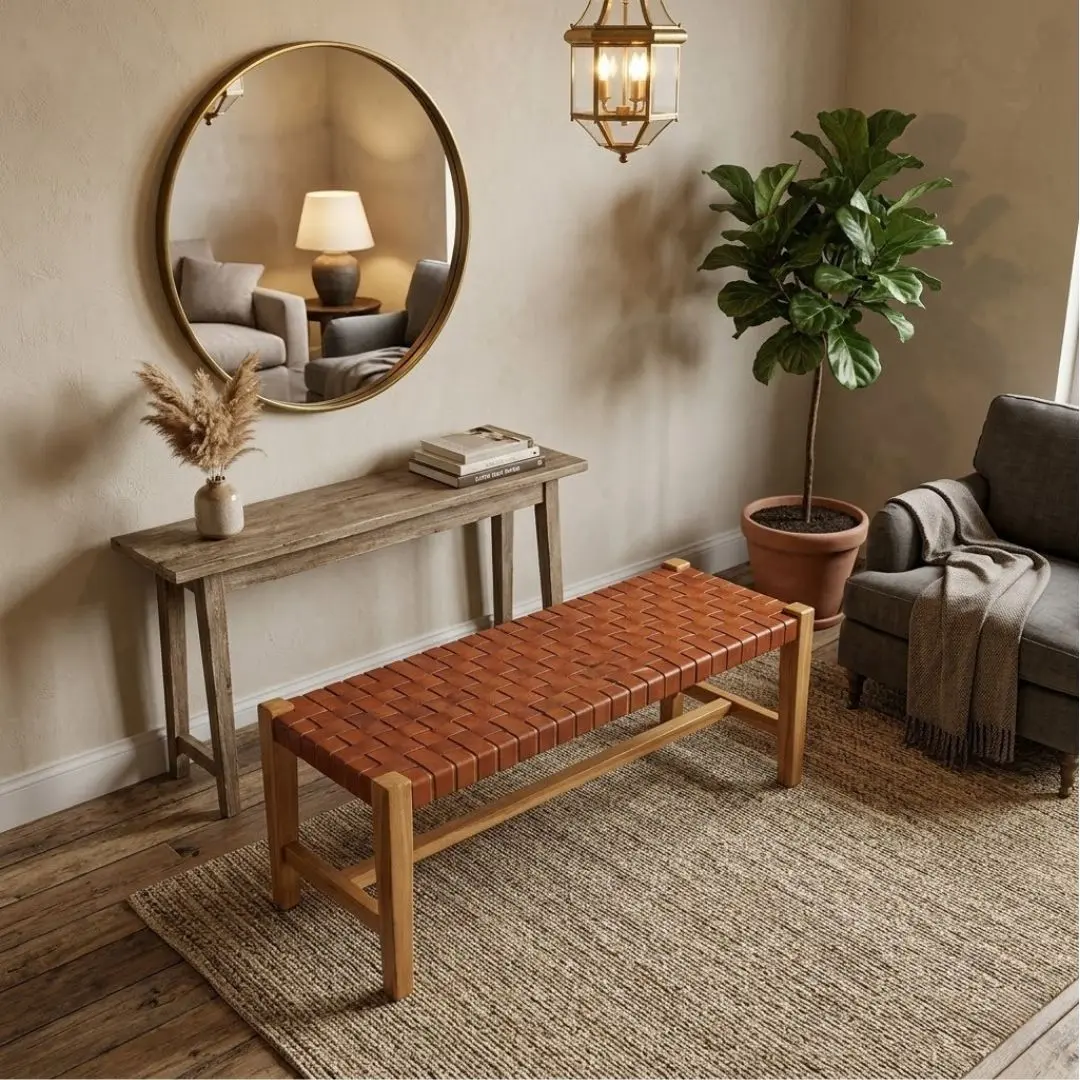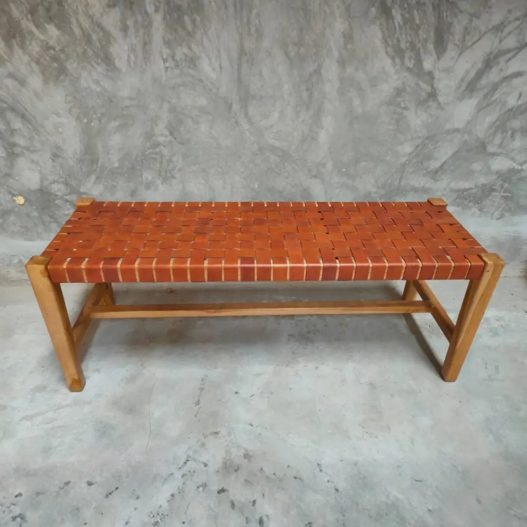 The classic elegance of leather blends seamlessly with the natural tones of teak wood, creating an eclectic piece that enhances your foyer or living room. This bench brings both style and practicality to your home—perfect for comfortable seating or as a functional addition to your shoe area. Versatile in design, it can be placed wherever you need a touch of sophistication and convenience.